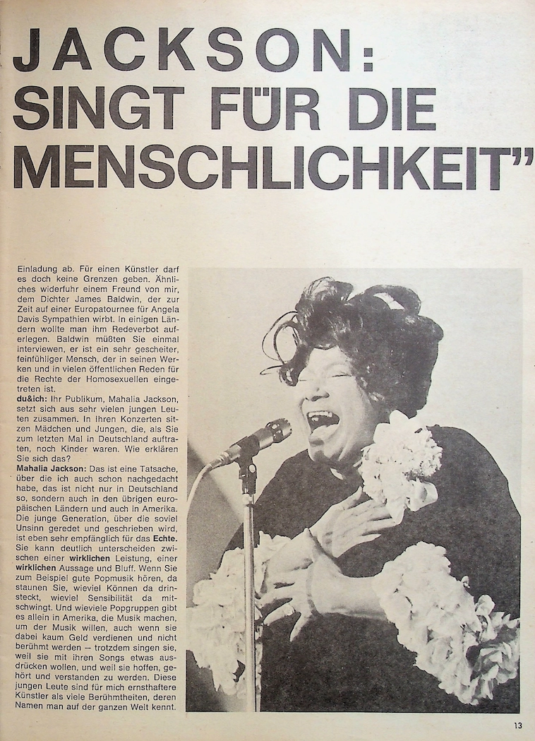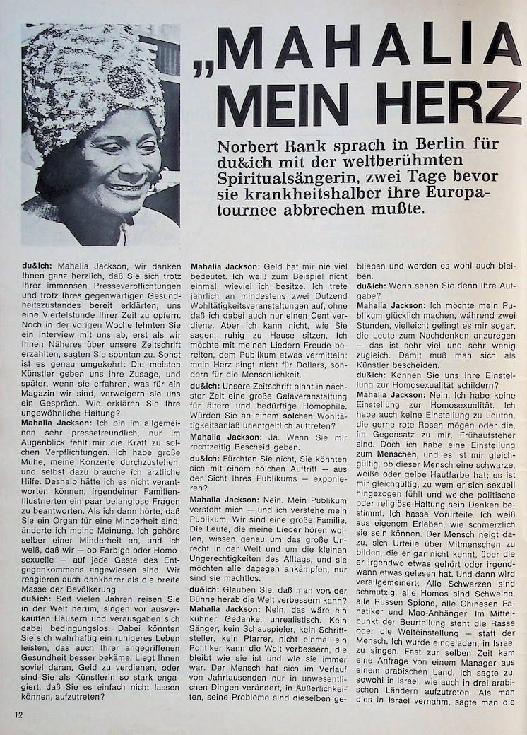 In the January 1972 issue of the German gay magazine "du&ich," a remarkable interview with Mahalia Jackson appeared, providing a deep insight into her thoughts. Norbert Rank spoke with the world-famous spiritual singer in Berlin for du&ich two days before she had to cancel her European tour due to illness.
