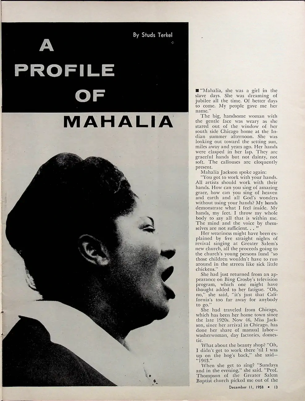 Her exhaustion may have been due to five nights of revival singing at the new Greater Salem Church, all proceeds of which went to the church's youth fund “so these kids won't be hanging around on the streets like sick little chickens.” She had just returned from an appearance on Bing Crosby's television program, which may have added to her fatigue. “Oh, no,” she said, “it's just that California is too far away for everyone.” She had traveled from Chicago, where she had lived since the late 1920s. At 46, Miss Jackson had done her share of physical labor since arriving in Chicago—as a laundress, factory day laborer, and housekeeper.