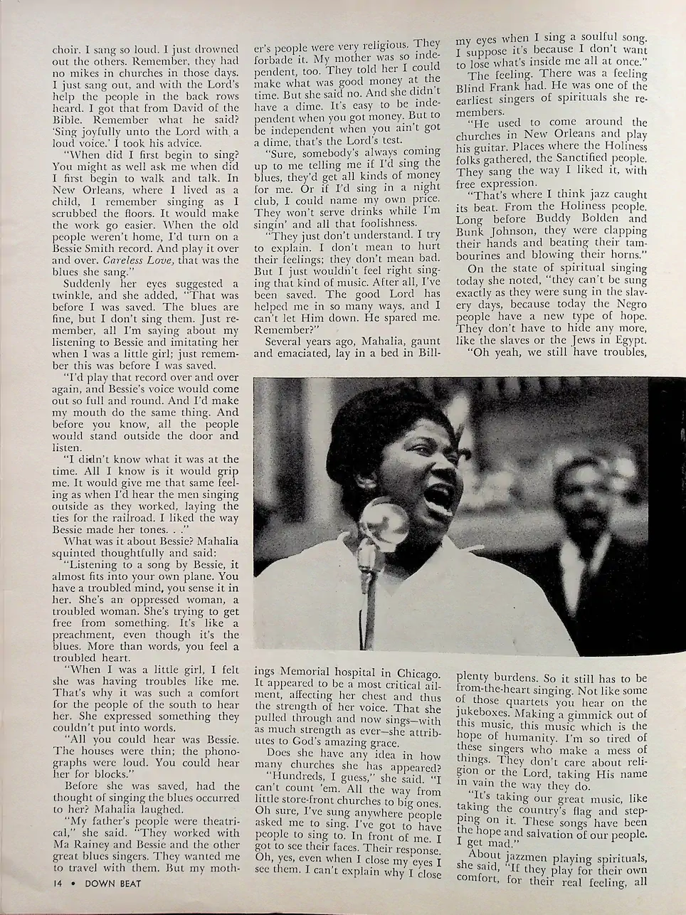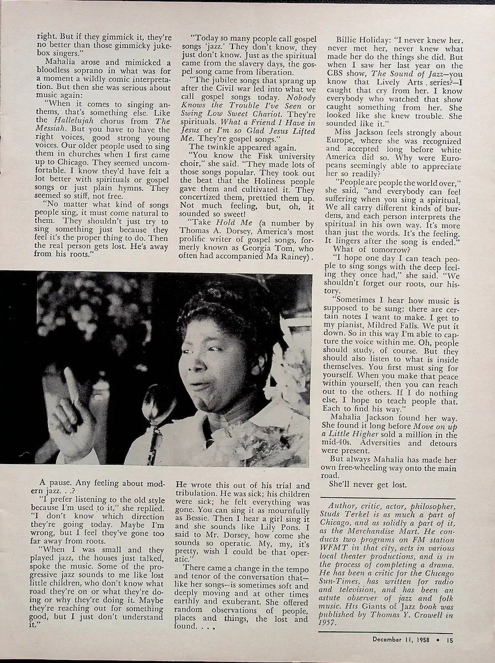 ‘Take Hold My Hand’ (a piece by Thomas A. Dorsey, America's most prolific gospel songwriter, formerly known as Georgia Tom, who often accompanied Ma Rainey). He wrote this out of his distress and suffering. He was sick, his children were sick; he felt like everything was over. You can sing it as sadly as Bessie. Then I hear a girl sing it and she sounds like Lily Pons. I told Mr. Dorsey how operatic she sounded. My goodness, that's pretty, I wish I could be that operatic."There was a change in the tempo and tone of the conversation, which, like her songs, was sometimes gentle and deeply moving, and at other times earthy and exuberant. She offered random observations about people, places, and things, about what she had lost and gained.Billie Holiday: “I never knew her, never met her, never found out what made her do what she did. But when I saw her last year on the CBS show ”The Sound of Jazz" — you know Lively Arts is serious, right? —I caught that cry from her. I know everyone who saw that show got something from her. She looked like she knew what hardship was. She sounded like it, too."Miss Jackson has a strong connection to Europe, where she was appreciated and accepted long before white people in America. Why did Europeans seem to appreciate her so easily and quickly? “People are people all over the world,” she said, “and anyone can suffer when you sing a spiritual. We all carry different kinds of burdens, and everyone interprets the spiritual in their own way. It's about more than just the words. It's the feeling. It lingers long after the song is over.”