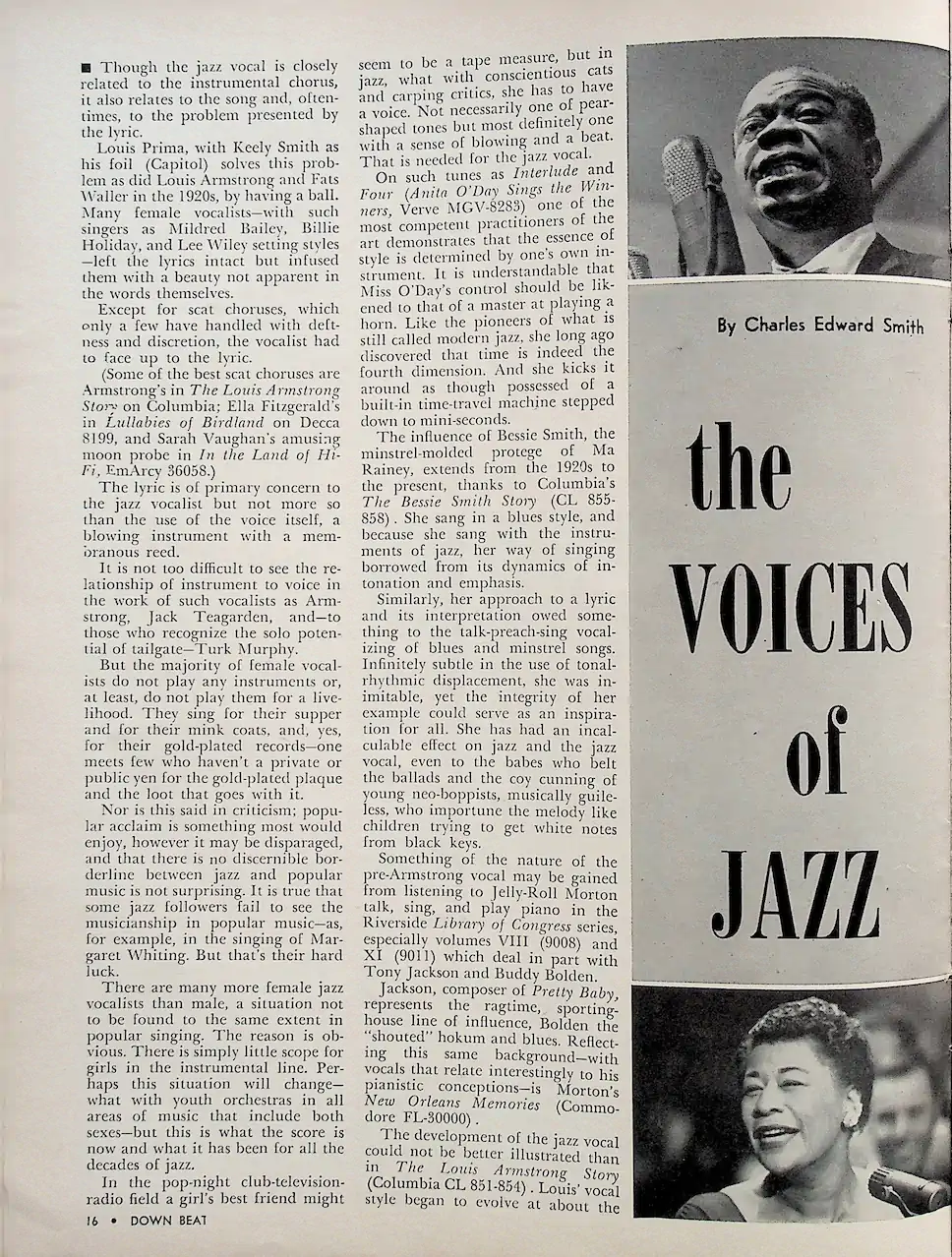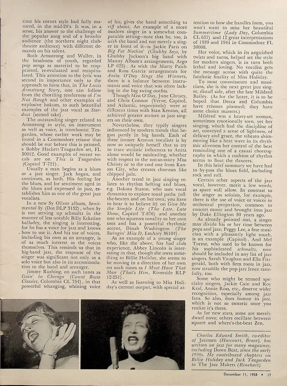 Likewise, her approach to lyrics and their interpretation was somewhat reminiscent of the talk-preach-sing vocal technique of blues and minstrel songs. Infinitely subtle in her use of pitch shifts and rhythmic shifts, she was inimitable, but the integrity of her role model could serve as inspiration for all. She had an invaluable influence on jazz and jazz singing, even for the little ones who sing ballads and the young neo-boppists who are less musically sophisticated, who rush the melody like children trying to get white notes out of black keys.Something of the nature of the vocal style before Armstrong can be heard when listening to Jell-Roll Morton on the Riverside Library of Congress series, particularly volumes VIII (9008) and XI (9011), which deal in part with Tony Jackson and Buddy Bolden.